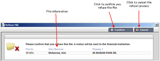 If you do not want or if you are unable to handle a new file, you can refuse it and inform by this way the financial institution which will reassign it. The new file will be removed from your list of files. Besides a lawyer/notary, legal assistants and other lawyers/notaries can refuse a file in the name of the lawyer/notary they work with, if delegated that right.